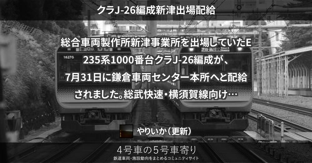 今月26日に総合車両製作所新津事業所を出場し、信越線にて公式試運転が行われていたE235系1000番台クラJ-26編成が、本日31日、湘南方面へと配給輸送されています。牽引機は、EF64 1031 です。前例から、鎌倉車両センター本所へと配...
