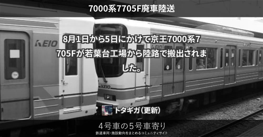 8月1日から5日にかけて京王7000系7705Fが若葉台工場から陸路で搬出されました。