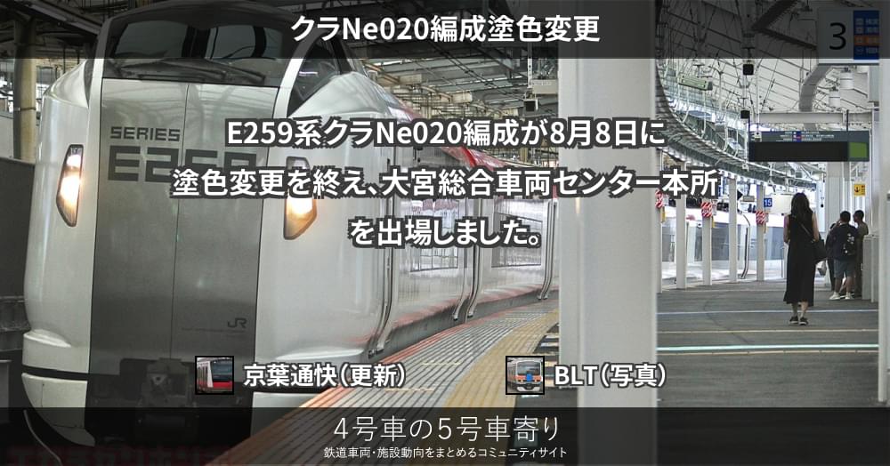 E259系クラNe020編成が8月8日に塗色変更を終え、大宮総合車両センター本所を出場しました。