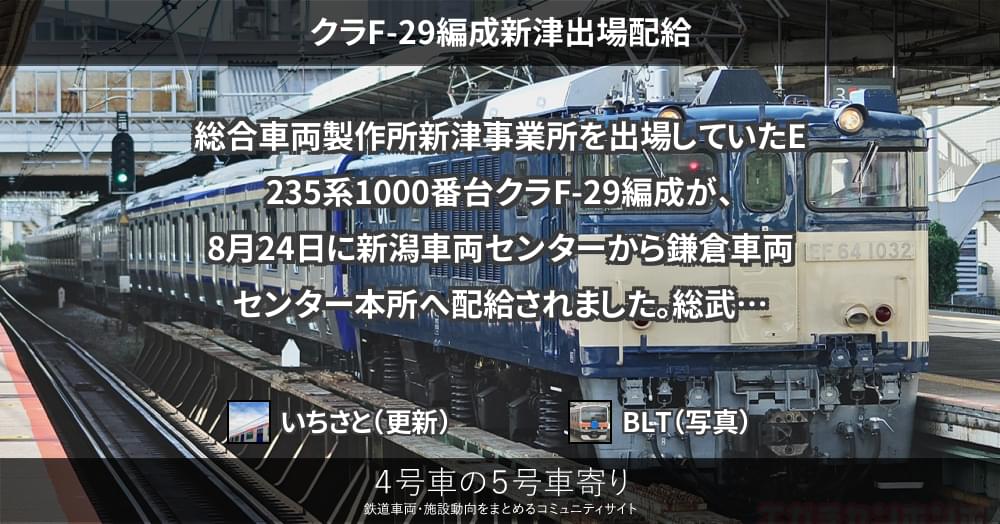 総合車両製作所新津事業所を出場していたE235系1000番台クラF-29編成が、8月24日に新潟車両センターから鎌倉車両センター本所へ配給されました。