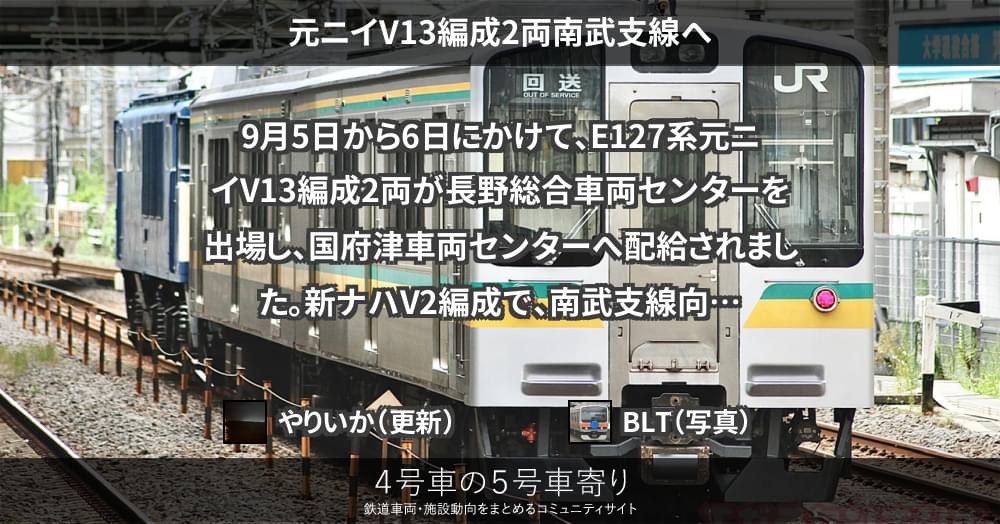 9月5日から6日にかけて、E127系元ニイV13編成2両が長野総合車両センターを出場し、国府津車両センターへ配給されました。