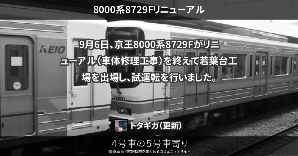 9月6日、京王8000系8729Fがリニューアル(車体修理工事)を終えて若葉台工場を出場し、試運転を行いました。