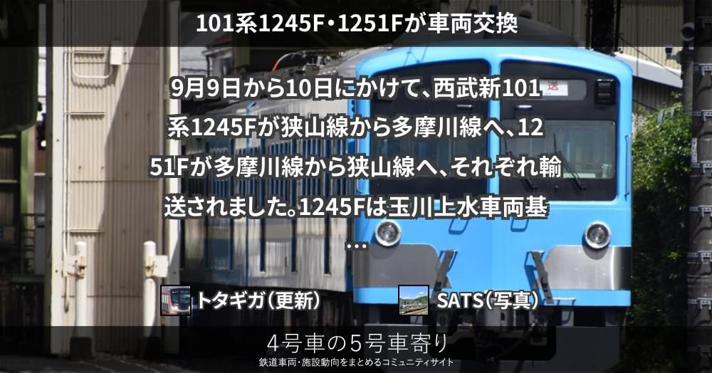 9月9日から10日にかけて、西武新101系1245Fが狭山線から多摩川線へ、1251Fが多摩川線から狭山線へ、それぞれ輸送されました。