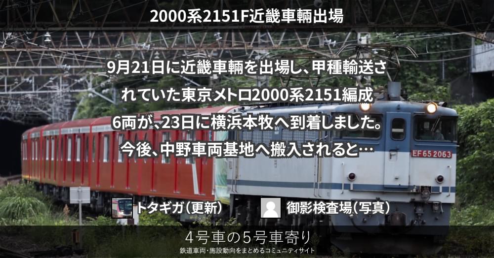 9/21、東京メトロ丸ノ内線向け2000系2151Fが近畿車輛を出場し、徳庵駅から甲種輸送されています。吹田タまでがDD200-4、吹田タからEF65 2060が牽引しています。