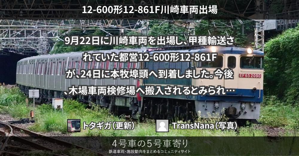 本日、都営地下鉄大江戸線向け12-600形の12-861Fが川崎車両を出場し、同編成の甲種輸送が開始されています。出場時の牽引は、愛知機関区のDD200形4号機(DD200-4)が担当しています。