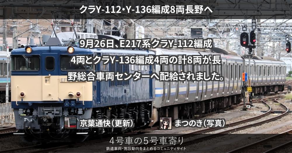 9月26日、E217系クラY-112編成4両とクラY-136編成4両の計8両が長野総合車両センターへ配給されました。