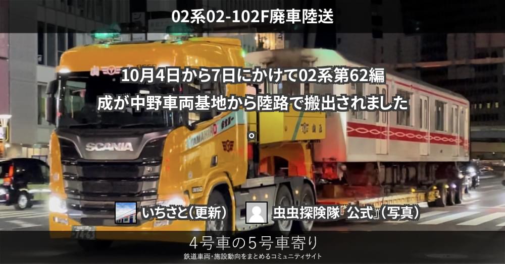 10月4日から7日にかけて02系第62編成が中野車両基地から陸路で搬出されました。