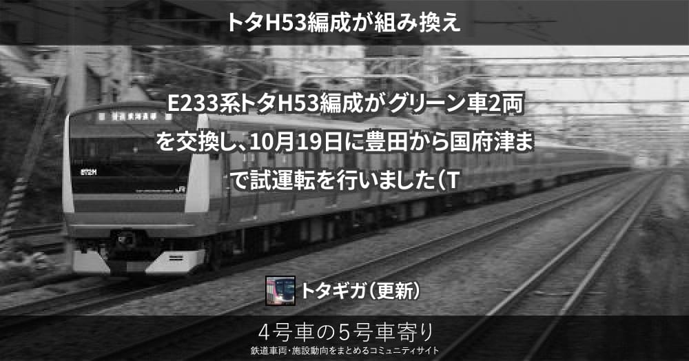 本日、サロE232-4,サロE233-4を組み込んだ中央快速線E233系0番台トタH53編成の試運転が確認されています。10月6日にはサロE232-3,サロE233-3の試運転が同編成によって行われており、グリーン車を組み替えての試運転とな...