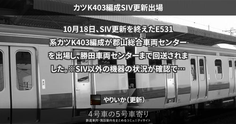 本日、常磐線E531系0番台基本編成カツK403編成が郡山総合車両センターを出場し、試運転を兼ねて勝田車両センターまで自力で回送されています。撮影記録から指定保全に加えて、補助電源装置(SIV)が新品の物へと換装されていることが確認でき、機...