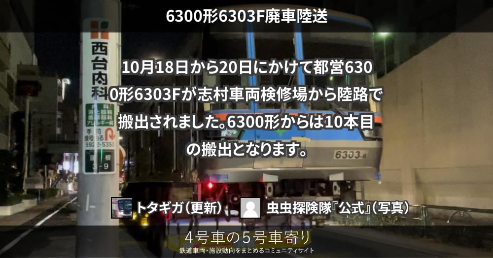 10月18日から20日にかけて都営6300形6303Fが志村車両検修場から陸路で搬出されました。6300形からは10本目の搬出となります。