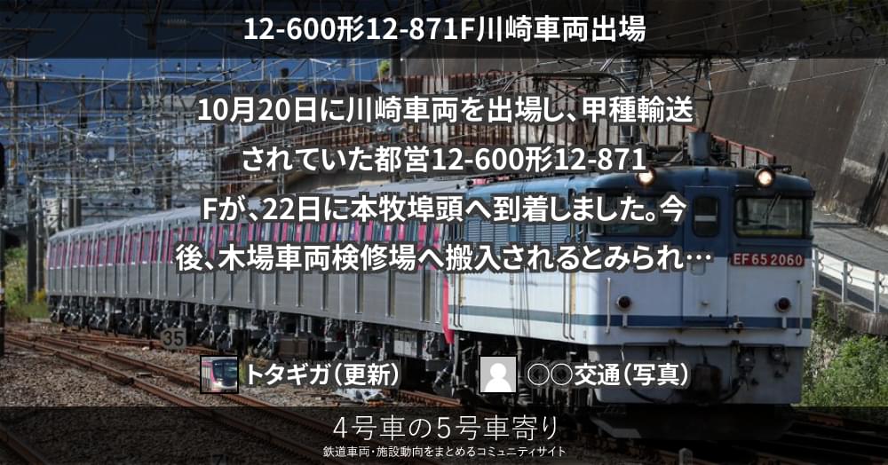 本日、都営地下鉄大江戸線向け12-600形の12-871Fが川崎車両を出場し、甲種輸送が開始されています。出場時はDD200形4号機()が、吹田貨物ターミナル(吹田タ)からはEF65形2000番台2060号機()が牽引機として充当されていま...