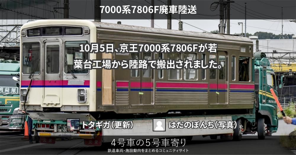 10月5日、京王7000系7806Fが若葉台工場から陸路で搬出されました。