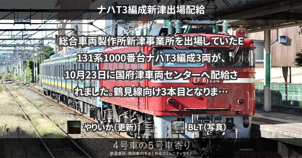 総合車両製作所新津事業所を出場していたE131系1000番台ナハT3編成3両が、10月23日に国府津車両センターへ配給されました。