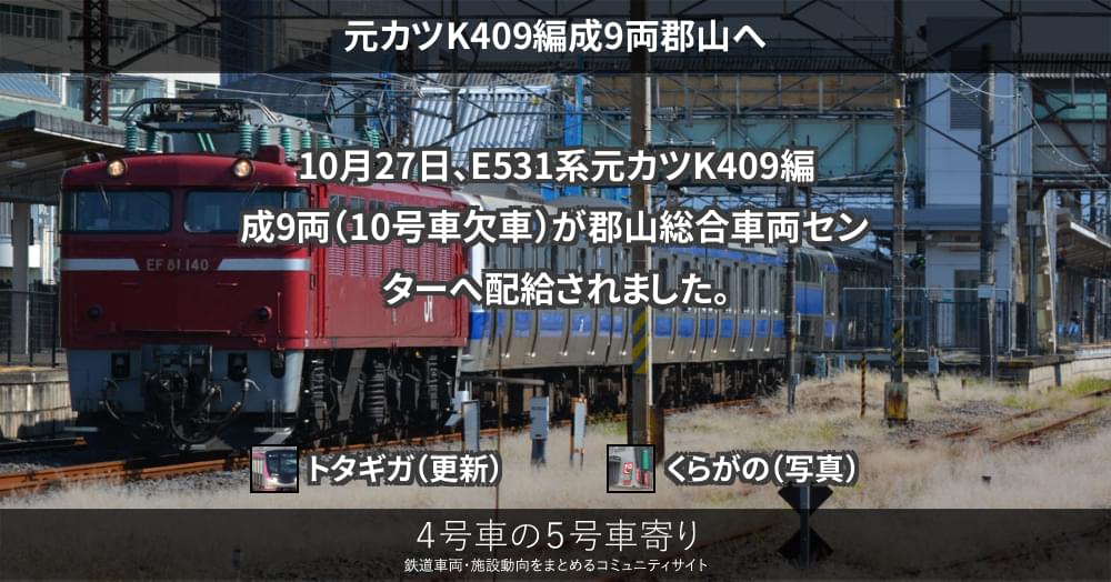 10月27日、E531系元カツK409編成9両(10号車欠車)が郡山総合車両センターへ配給されました。