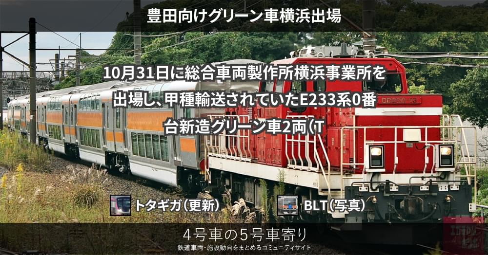 10月31日に総合車両製作所横浜事業所を出場し、甲種輸送されていたE233系0番台新造グリーン車2両(TsdTsd'5~8)が、11月1日に豊田へ到着しました。