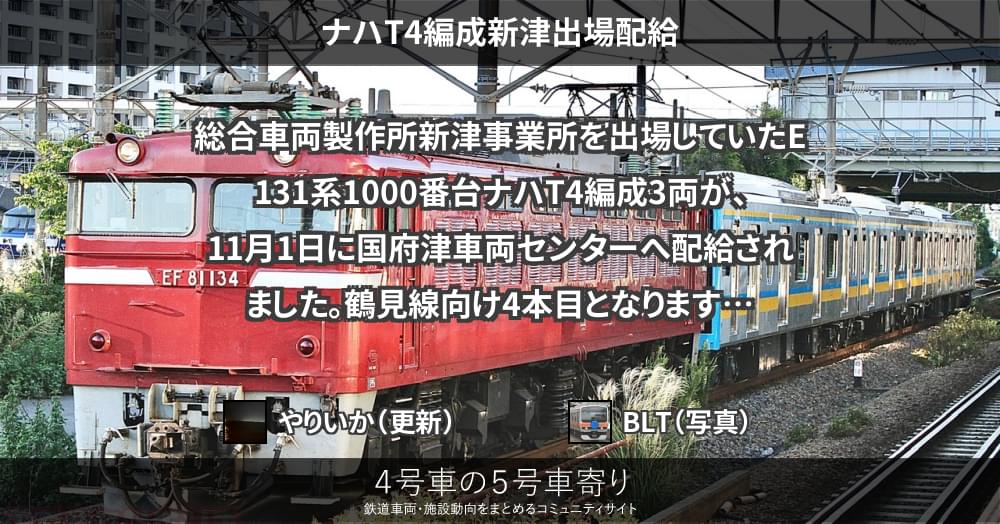 総合車両製作所新津事業所を出場していたE131系1000番台ナハT4編成3両が、11月1日に国府津車両センターへ配給されました。