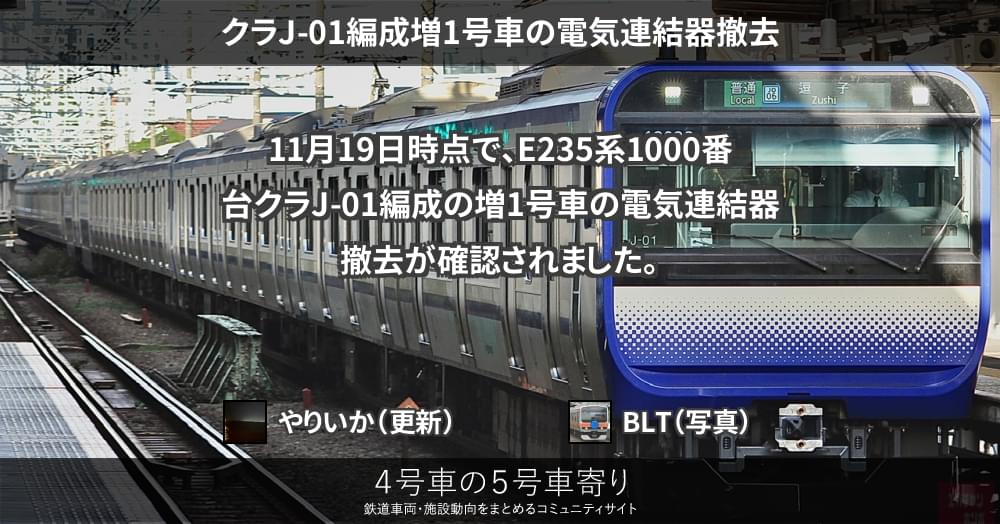 11月19日時点で、E235系1000番台クラJ-01編成の増1号車の電気連結器撤去が確認されました。