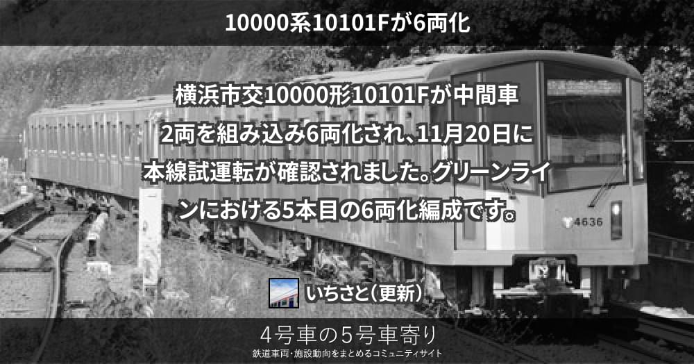 横浜市交10000形10101Fが中間車2両を組み込み6両化され、11月20日に本線試運転が確認されました。