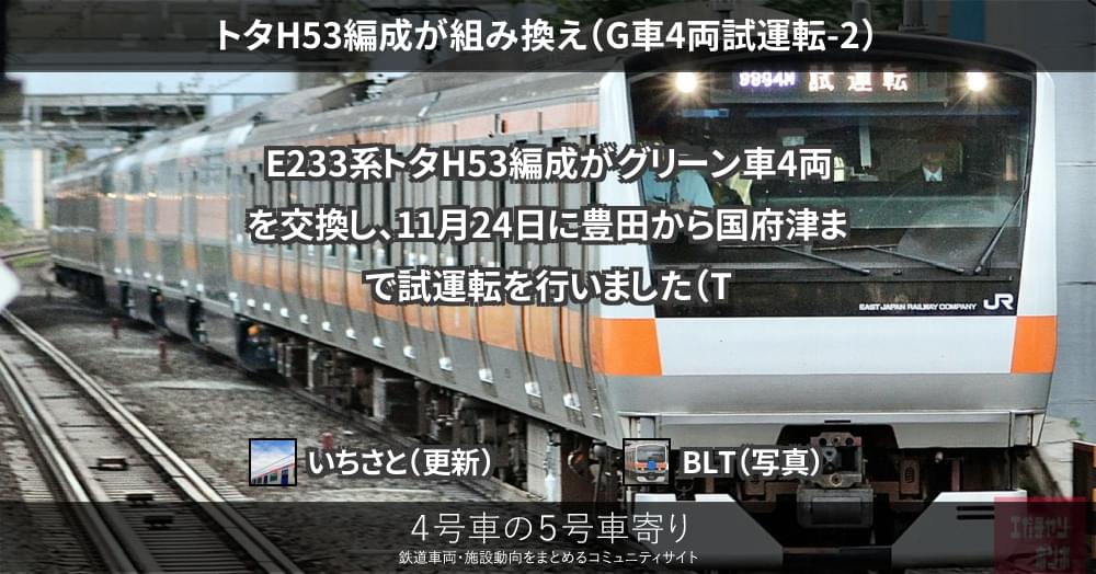 本日、中央快速線E233系0番台グリーン車4両(TsdTsd'7,8ユニット)を組み込んだトタH53編成(10両)の試運転が確認されています。組み込まれたグリーン車の公式試運転と見られます。先日はTsdTsd'5,6を組み込んだ試運転でした...
