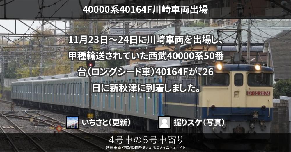 11月23日~24日に川崎車両を出場し、甲種輸送されていた西武40000系50番台(ロングシート車)40164Fが、26日に新秋津に到着しました。