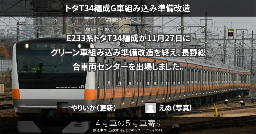 本日、E233系トタT34編成が長野総合車両センターを出場し、所属先の豊田車両センターへ自走で回送されています。前例からG車組み込み準備改造が行われたものと推測されます。同形式のT編成(10両貫通編成)で未入場の編成は残り2編成(T35編成...