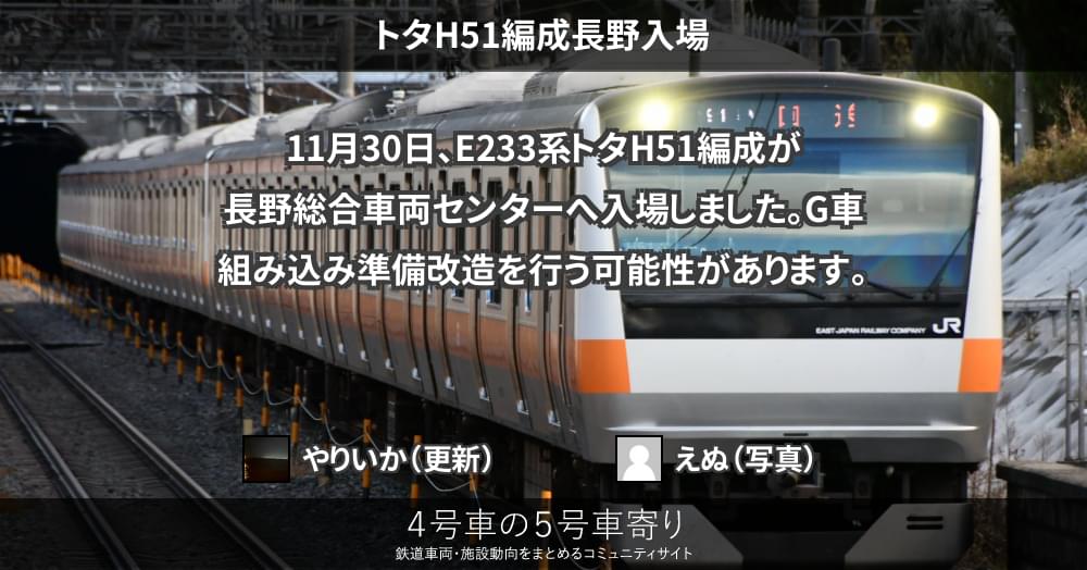 11/30、E233系トタH51編成が信州方面へ自走で回送されています。長野総合車両センターへ入場した場合、グリーン車組込準備改造を行う可能性があります。
