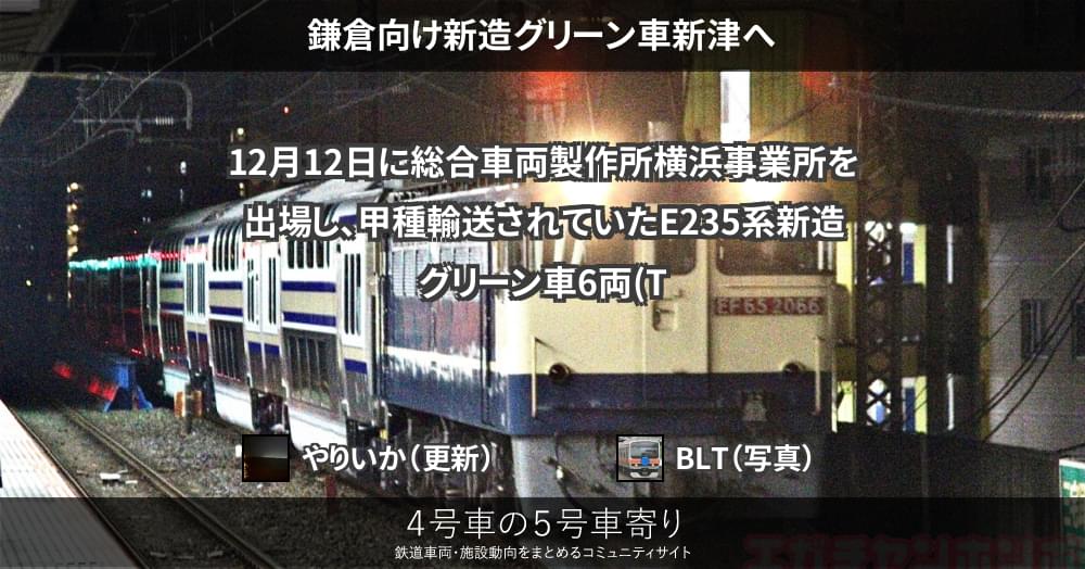 12月12日に総合車両製作所横浜事業所を出場し、甲種輸送されていたE235系新造グリーン車6両(TsdTsd’1032〜1034)が、13日に新津へ到着しました。