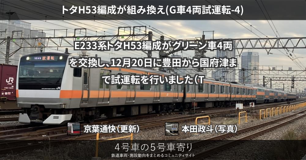 E233系トタH53編成がグリーン車4両を交換し、12月20日に豊田から国府津まで試運転を行いました(TsdTsd'9~10→TsdTsd'11~12)。