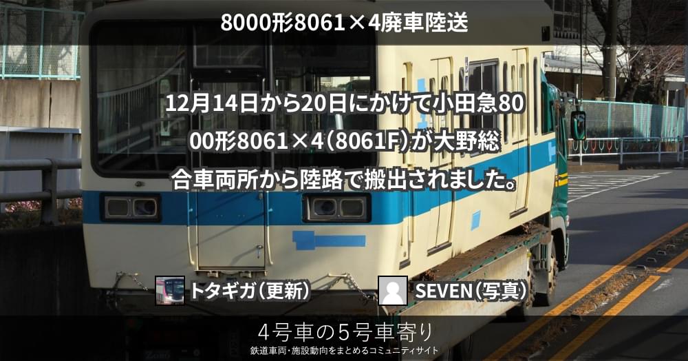 12月14日から20日にかけて小田急8000形8061×4(8061F)が大野総合車両所から陸路で搬出されました。