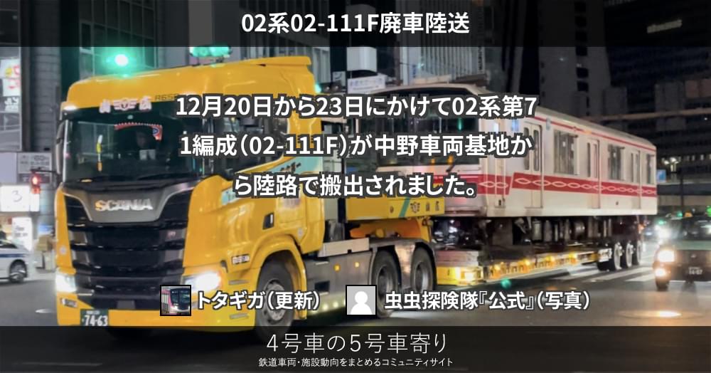 12月20日から23日にかけて02系第71編成(02-111F)が中野車両基地から陸路で搬出されました。