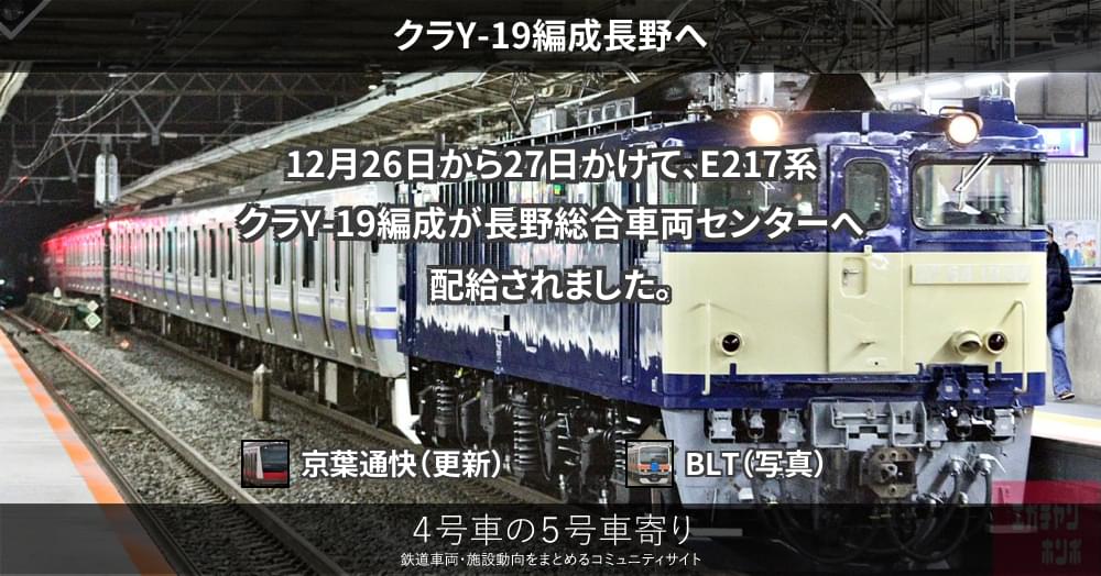 12月26日から27日かけて、E217系クラY-19編成が長野総合車両センターへ配給されました。