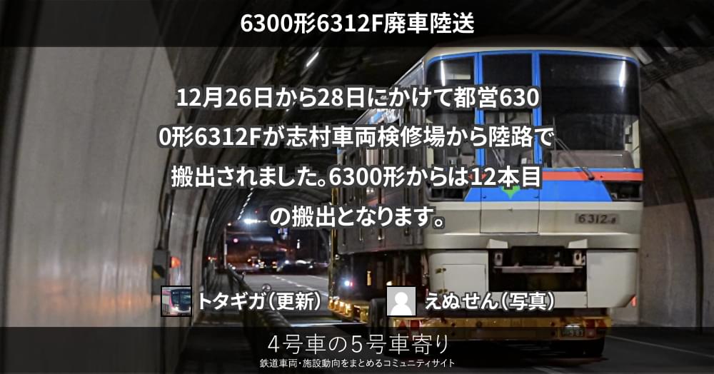 12月26日から12月28日未明にかけて、都営三田線6300形2次車の6312Fが、所属先の志村車両検修場から搬出されました。前例から、廃車に伴う陸送と思われます。6312Fの搬出により、6300形の2次車は消滅となり、残る搬出対象の編成は...