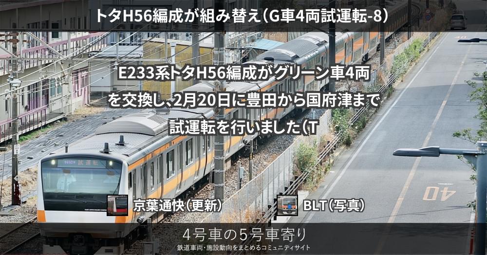 2/20、E233系グリーン車のサロE232-19、サロE232-20、サロE233-19、サロE233-20の4両が、トタH56編成6両に組み込まれ、10両で試運転が行われてます。前列同様、グリーン車の公式試運転と推測されます。