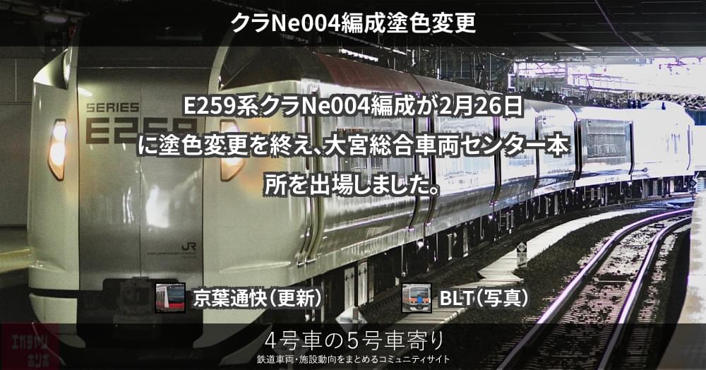 大宮総合車両センター本所へ入場してたE259系 クラNe004編成ですが、2/26、湘南方面へ自走で回送されてます。検査は行われておらず、リニューアル塗装への変更のみ行われてます。現在、大宮総合車両センター本所へはクラNe021編成が入場中...