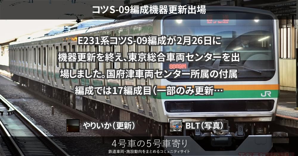 E231系コツS-09編成が2月26日に機器更新を終え、東京総合車両センターを出場しました。