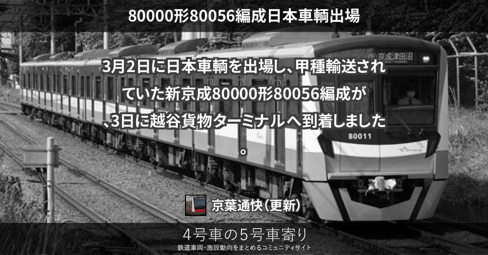 3月2日に日本車輌を出場し、甲種輸送されていた新京成80000形80056編成が、3日に越谷貨物ターミナルへ到着しました。