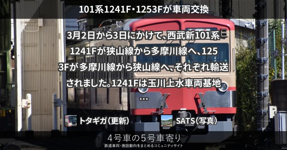 3月2日から3日にかけて、西武新101系1241Fが狭山線から多摩川線へ、1253Fが多摩川線から狭山線へ、それぞれ輸送されました。