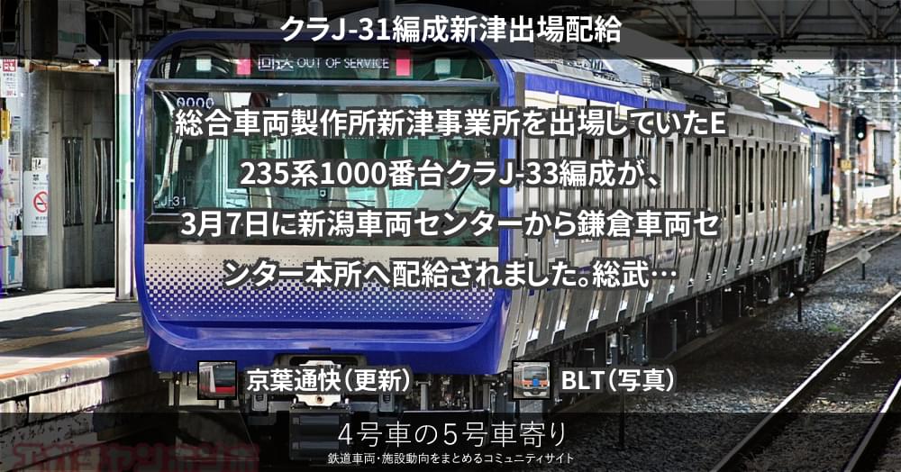 総合車両製作所新津事業所を出場していたE235系1000番台クラJ-33編成が、3月7日に新潟車両センターから鎌倉車両センター本所へ配給されました。