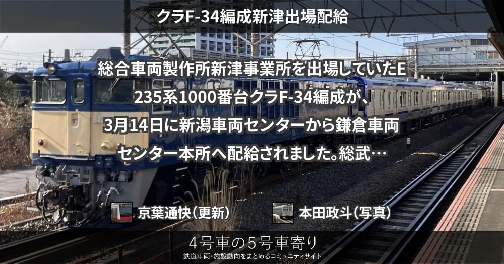 総合車両製作所新津事業所を出場していたE235系1000番台クラF-34編成が、3月14日に新潟車両センターから鎌倉車両センター本所へ配給されました。
