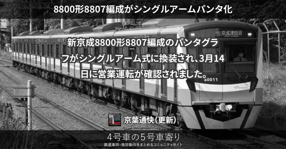 新京成8800形8807編成のパンタグラフがシングルアーム式に換装され、3月14日に営業運転が確認されました。