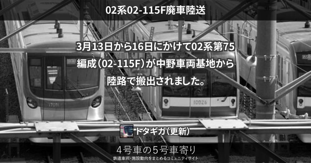 3月13日から16日にかけて02系第75編成(02-115F)が中野車両基地から陸路で搬出されました。
