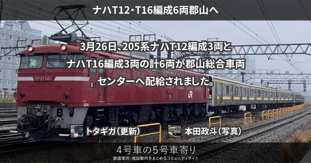 3月26日、205系ナハT12編成3両とナハT16編成3両の計6両が郡山総合車両センターへ配給されました。