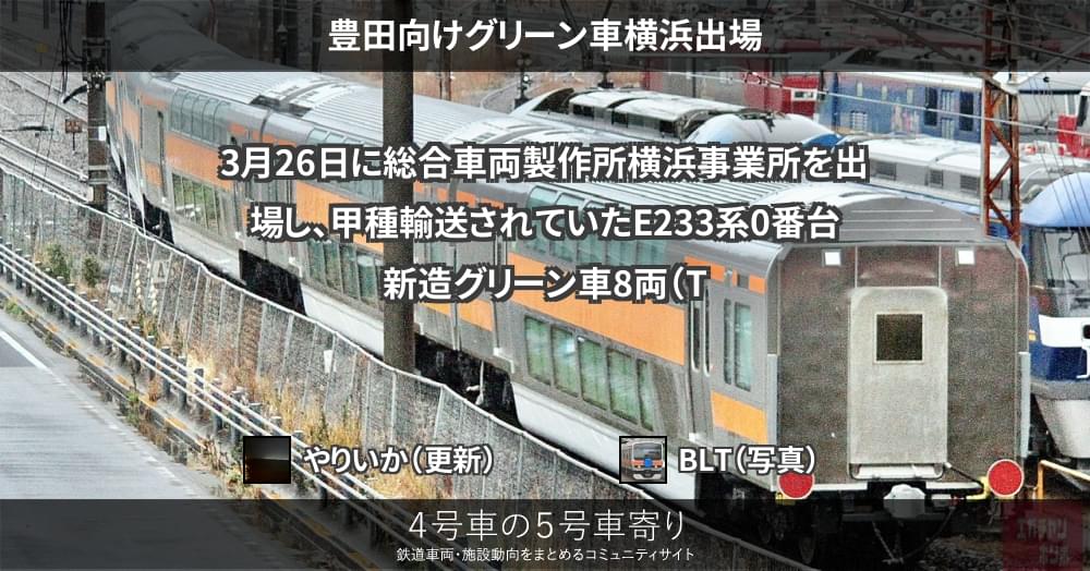 3月26日に総合車両製作所横浜事業所を出場し、甲種輸送されていたE233系0番台新造グリーン車8両(TsdTsd'25~28)が、27日に豊田へ到着しました。