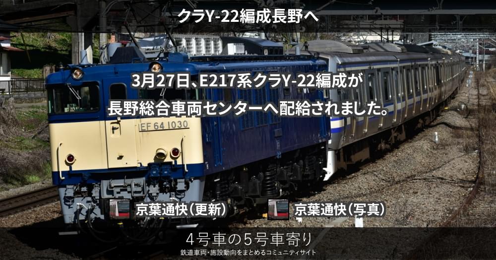 3月27日、E217系クラY-22編成が長野総合車両センターへ配給されました。