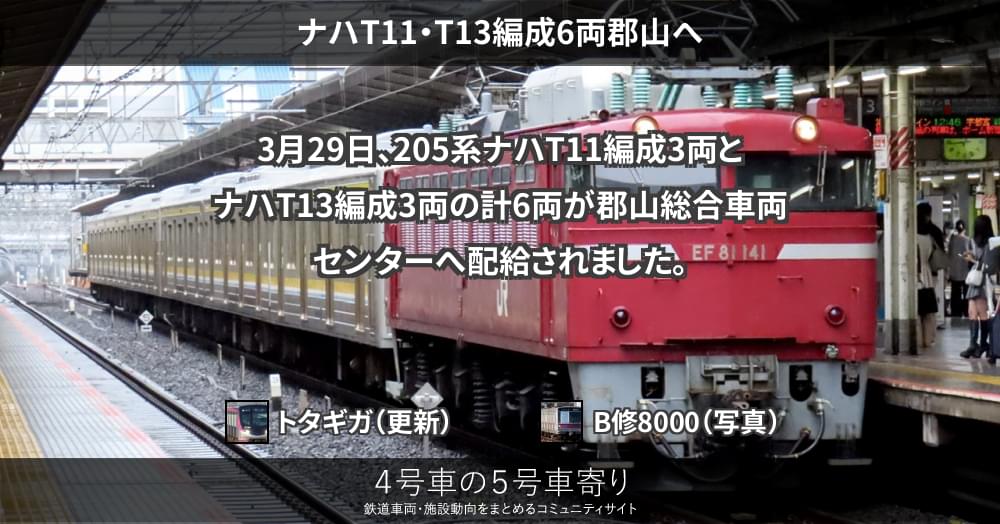 3月29日、205系ナハT11編成3両とナハT13編成3両の計6両が郡山総合車両センターへ配給されました。