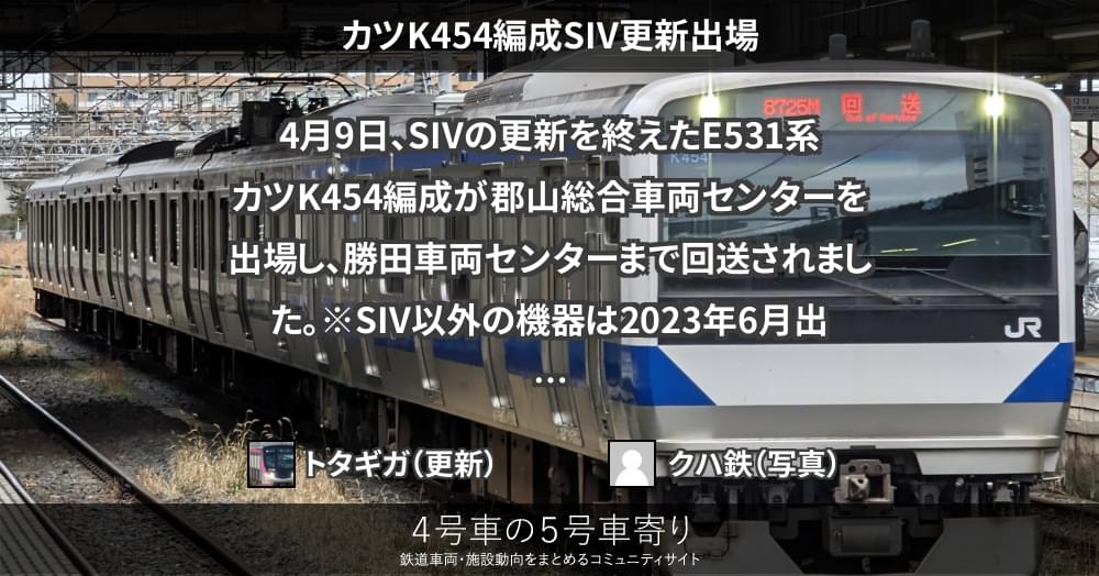4月9日、SIVの更新を終えたE531系カツK454編成が郡山総合車両センターを出場し、勝田車両センターまで回送されました。