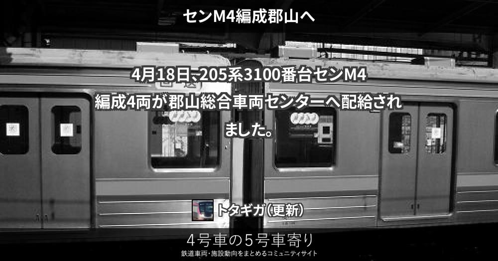 4月18日、205系3100番台センM4編成4両が郡山総合車両センターへ配給されました。