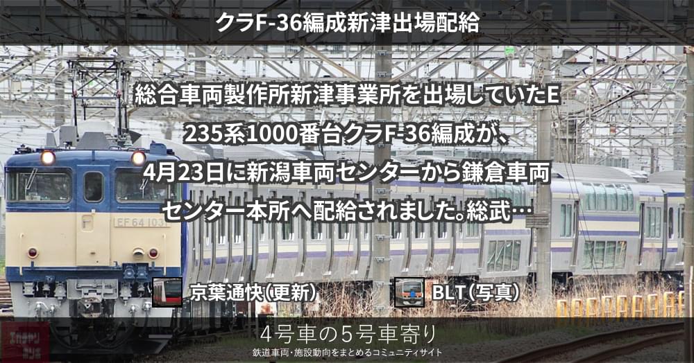総合車両製作所新津事業所を出場していたE235系1000番台クラF-36編成が、4月23日に新潟車両センターから鎌倉車両センター本所へ配給されました。