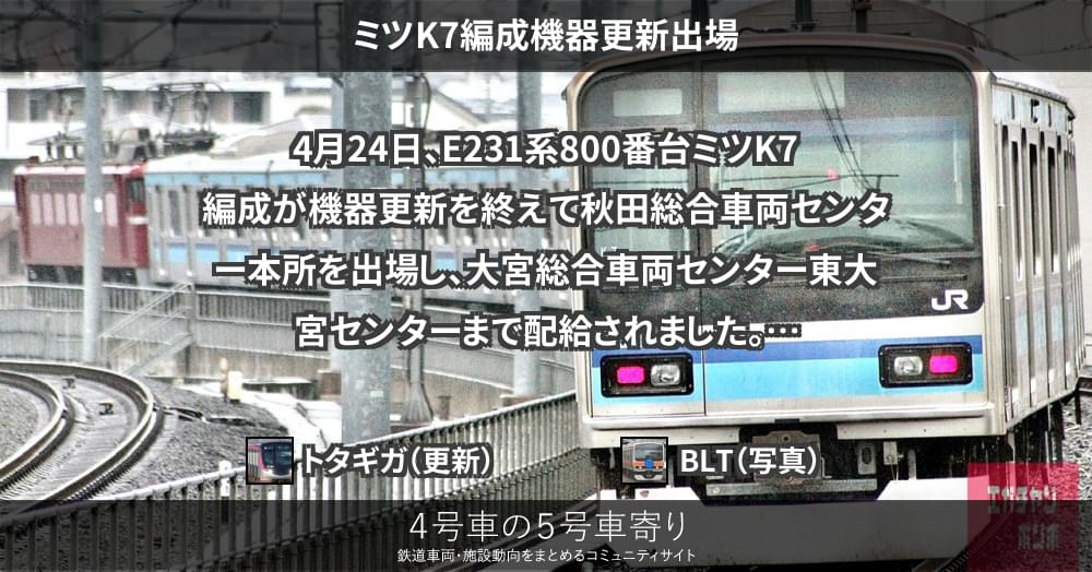 4月24日、E231系800番台ミツK7編成が機器更新を終えて秋田総合車両センター本所を出場し、大宮総合車両センター東大宮センターまで配給されました。今後、三鷹車両センターへ回送されるものとみられます。