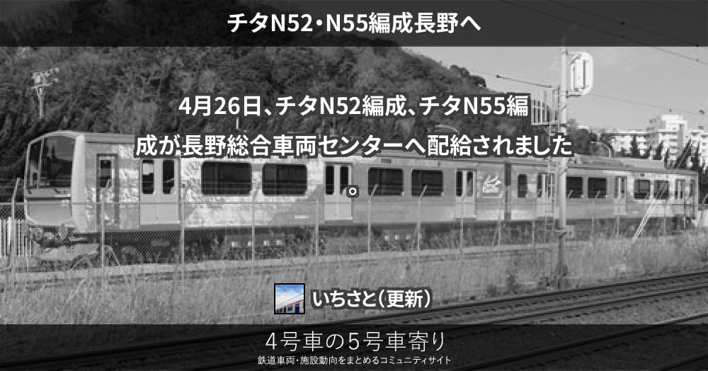 JRの車両その他(東) ページ目次 チタN52・N55編成長野へ 更新コンテンツ サイト投稿写真 2012/04/26 チタN52・N55編成長野へ 4月26日、チタN52編成、チタN55編成が長野総合車両センターへ配給されました。 更新コンテンツ 404 Not Found 上記コンテンツ傘下のページも含みます。 サイト投稿写真 投稿画像がありません。JRの車両その他(東)グループのアップローダーへ投稿頂いた写真は、こちらでご紹介致します。